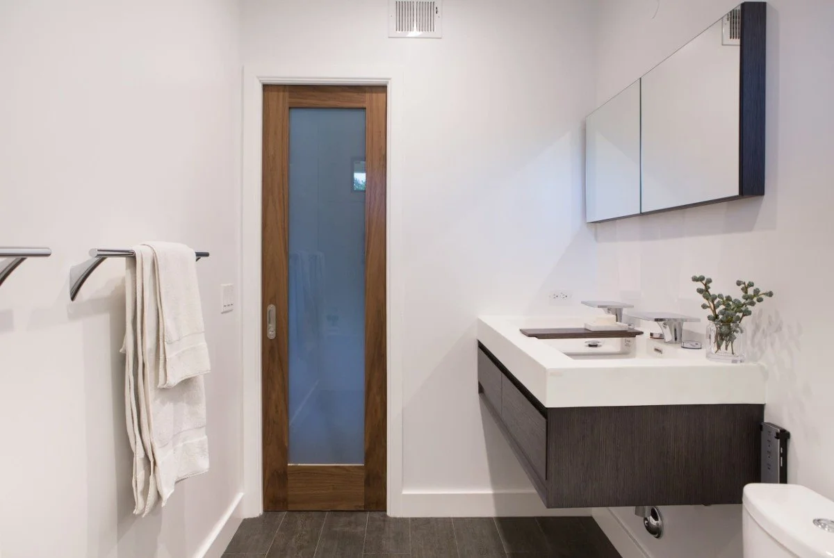 The design features sleek, frameless glass shower enclosures, large-format porcelain tiles, and a floating vanity that enhances the sense of openness. Subtle contrasts between warm wood tones and crisp white surfaces bring balance and depth to the space, while matte black fixtures add a bold, contemporary edge. Thoughtful lighting, including recessed ceiling lights, under-vanity illumination, and backlit mirrors, creates a bright yet relaxing atmosphere perfect for both daily routines and unwinding at the end of the day.